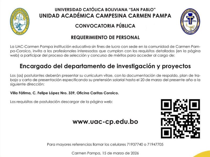 La Unidad Académica Campesina Carmen Pampa (UAC–Carmen Pampa) invita a profesionales calificados a participar del proceso de selección y concurso